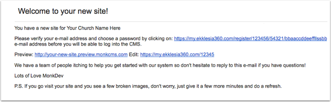 Check your inbox for an email titled, "Welcome to Your New Site." You will need to verify your e-mail address and choose a password before logging into Ekklesia360.